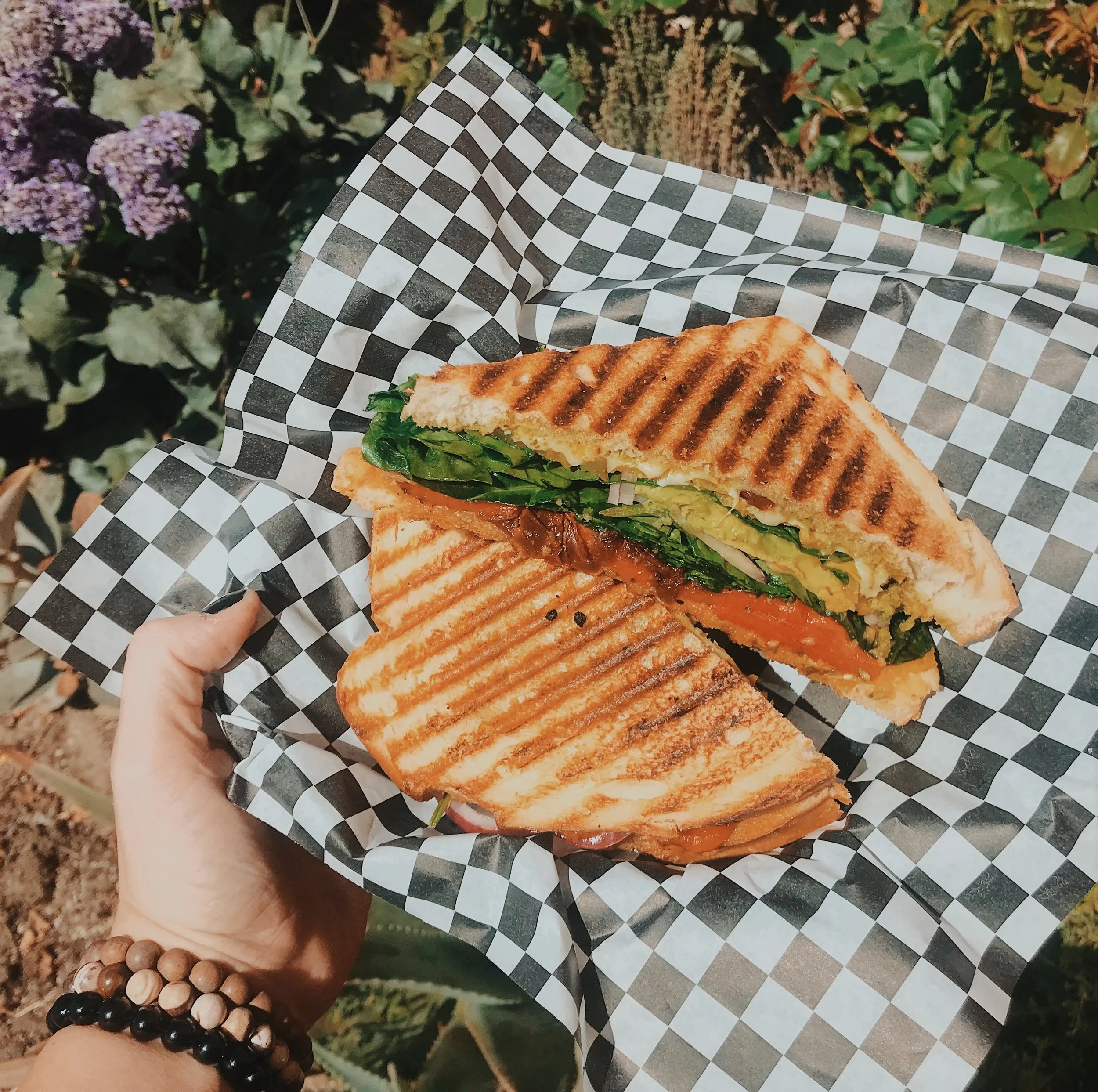 sourdough + fire roasted peppers + sun dried tomatoes + spinach + red onions + pickles+ pepperoncinis + avocado + pesto + cheese of your choice